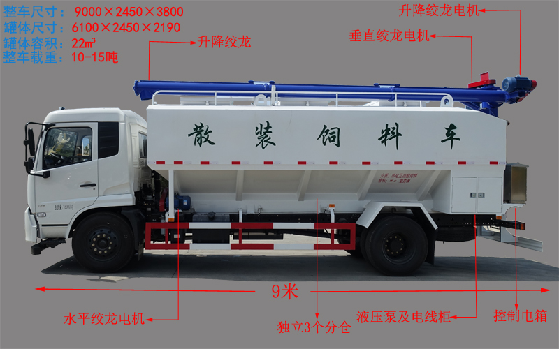 (4)料罐容積:20-24方,3個(gè)獨(dú)立倉(cāng),實(shí)載:豬料14噸,雞料16噸