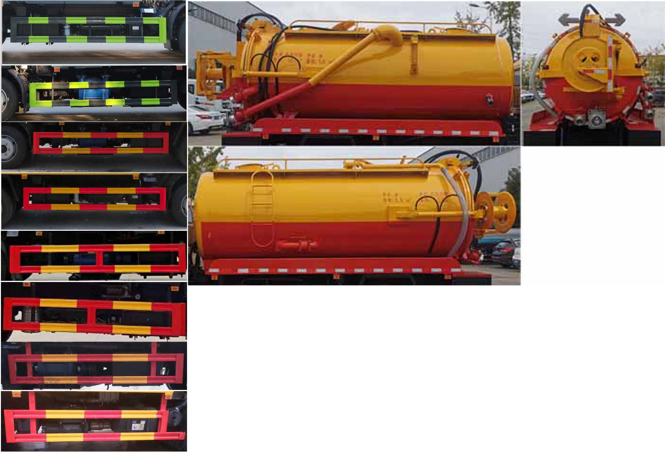 ABS型號:ABS/ASR-24V-4S/4M;ABS生產企業:襄陽東風隆誠機械有限責任公司;選裝描述:隨底盤選裝駕駛室;側、后防護材料均為:Q235碳鋼,側防護連接方式為:螺栓連接,后防護連接方式為:焊接連接,后部防護截面尺寸(mm):120×50,后部防護離地高度(mm):420;罐體外形尺寸(直段長×直徑)(mm):4300×1500(前部1000mm為清水罐,后部3300mm為污水罐)。邊掛清水罐尺寸(××)(mm):4150×600×1060;污水罐總容量:5.77立方米,污水罐有效容積:5.5立方米,介質:液態污物,密度800千克/立方米;清水罐總容量:4.62立方米,清水罐有效容積:4.4立方米,介質:,密度1000千克/立方米;專用功能及裝置:該車用于下水道排污及疏通,專用裝置:罐體及清洗吸污裝置;其他說明:卸料方式:舉升后卸;清水罐和污水罐為獨立罐體,清洗功能時用清水罐,吸污功能時用污水罐,污水罐和清水罐不可同時滿載;選裝燃油箱,電瓶,尿素罐,儲氣筒左右安裝位置。選裝限速裝置時最高車速為:89km/h。選裝左右及后部樣式。