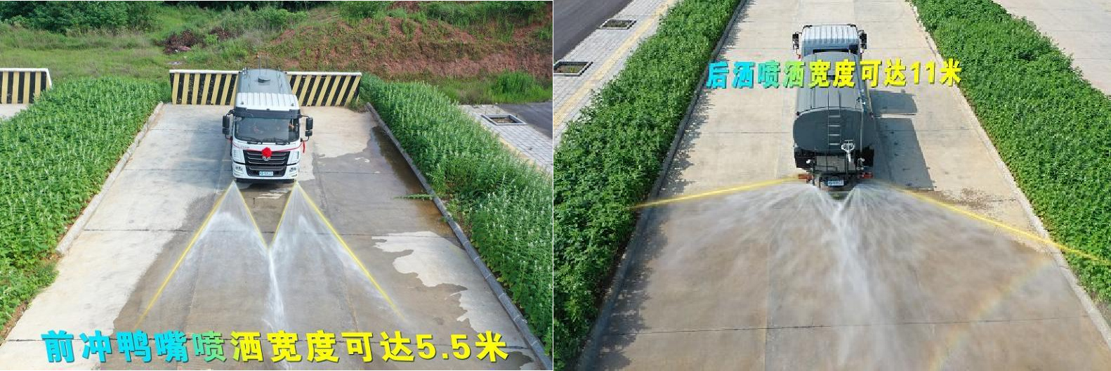 我公司產品標配前噴(鴨嘴)、后沖、后灑、側噴、后置式工作平臺,平臺上配置綠化水炮( 360°旋轉,既可以調成柱狀,也可以調成霧狀,更可以調成直沖狀、大雨、中雨、小雨、毛毛雨),配備優質大功率專用灑水泵可自吸自排,可從河里或池塘抽水到罐體取力器,雜物過濾網,消防接口,自流球閥系統、取力器、球閥、濾網均為國家標準產品,主管道加粗,法蘭墊、法蘭盤加厚,大通徑球閥。整體具備性能優良安全可靠、效率高、流量大、維修方便等特點。