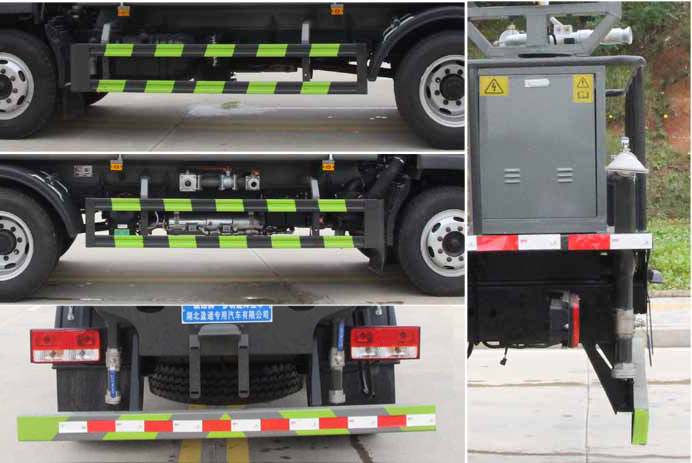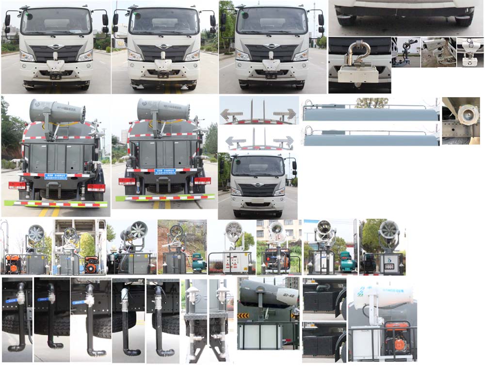 該車用途為抑塵降霾.主要裝置為罐體及噴霧裝置;罐體總容量:8.4立方米;罐體有效容積:8立方米;罐體外形尺寸(×長軸×短軸)(mm):4000×2100×1400.側、后防護材料均為:Q235碳鋼,連接方式均采用螺栓連接,后部防護截面尺寸(mm):120×50,后部防護離地高度(mm):450.ABS系統控制器型號:CM4XL-4S/4M,ABS系統控制器生產企業:廣州瑞立科密汽車電子股份有限公司.選裝前部電子炮樣式,選裝前部不帶電子水炮;當前部帶電子水炮時,車長為7950mm,前伸為500mm;當前部不帶電子水炮時,車長為7450mm,前伸為0mm.選裝噴霧裝置樣式,選裝罐體頂部高位花灑裝置,選裝大工作平臺,選裝車輛前部鴨嘴裝置,選裝自動球閥安裝位置,選裝箭頭燈裝置,選裝罐體頂部方形罐口及罐口位置,選裝尾部自流口裝置,后部作業燈僅在作業時開啟,車輛行駛過程中不可開啟.