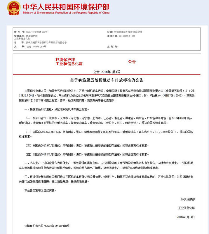為貫徹《中華人民共和國大氣污染防治法》,嚴格控制機動車污染,全面實施《輕型汽車污染物排放限值及測量方法(中國第五階段)》(GB18352.5-2013)和《車用壓燃式、氣體燃料點燃式發動機與汽車排氣污染物排放限值及測量方法(中國Ⅲ、Ⅳ、Ⅴ階段)》(GB17691-2005)中第五階段排放標準(以下簡稱國五標準)要求,經國務院同意,現就有關事宜公告如下: