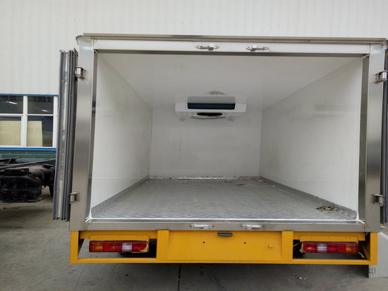 冷藏車廂體:采用國標A級聚氨酯保溫材料,厚度為8厘米,廂體內外采用玻璃鋼材質全包裹。不銹鋼鎖件。包角、包邊鋁合金型材。底盤采用高強度花紋鋁板定制。可選裝肉鉤導軌,和底部通風槽。廂體材質為內外玻璃鋼,中間夾層采用5個厚聚氨酯發(fā)泡隔熱材料,廂體一次成型,底板為花紋鋁板,門框邊飾全不銹鋼件,后門雙開