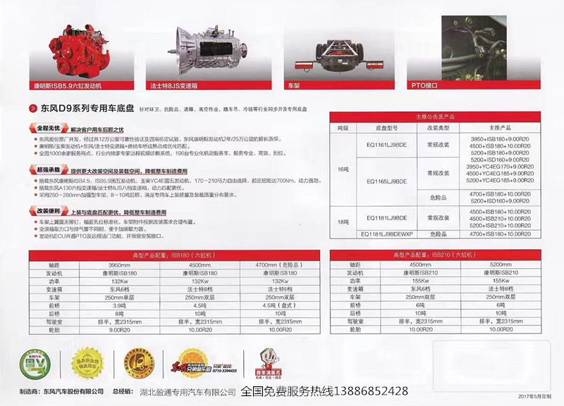 東風多利卡D9,3950/4500軸距,玉柴200馬力/康明斯195馬力,4缸機,法士特八檔(高低速),9.00R20胎,斷氣剎,電動玻璃,空調