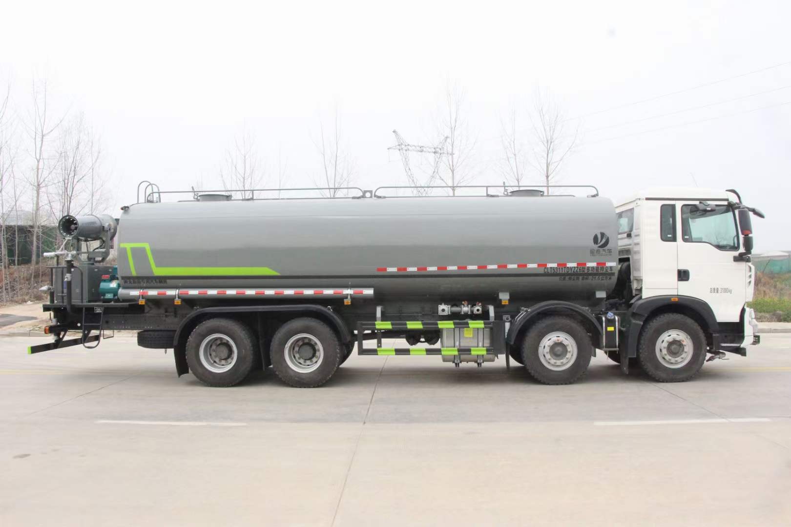 豪沃28方灑水車_重汽豪沃28方抑塵車_重汽曼350霧炮車_湖北盈通專用汽車有限公司,該車用途為城鄉道路和鐵路礦場的抑塵降霾,主要裝置為罐體及噴霧裝置.罐體總容量:22.6立方米,罐體有效容積:21.5立方米;罐體外形尺寸(×長軸×短軸)(mm):7700×2480×1730.ABS系統控制器生產企業/型號為威伯科(上海)管理有限公司/4460046300;選裝EBS,EBS系統控制器生產企業/型號為威伯科(上海)管理有限公司/EBS3.側、后防護材料均為:Q235碳鋼,連接方式均為:螺栓連接,后部防護截面尺寸(mm):120×50,后部防護離地高度(mm):490.僅采用底盤1800+3800+1350軸距(mm)改裝.隨底盤選裝前面罩,選裝后處理樣式,選裝踏步樣式.選裝前部不帶電子霧炮,選裝前部電子霧炮樣式.當前部不帶電子霧炮時,車輛長度11550mm,無前伸;當前部選裝電子霧炮時,車輛長度12050mm,前伸500mm.后軸僅采用鋼板彈簧懸架.選裝自動球閥位置,選裝后對沖裝置,選裝罐體頂部高位花灑裝置,選裝前沖裝置樣式.隨底盤選裝駕駛室.選裝噴霧裝置樣式.選裝箭頭燈裝置,選裝方形罐口及罐口位置,選裝尾部自流口裝置,選裝工具箱裝置.