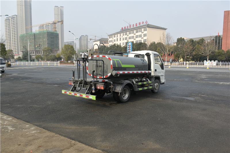 福田小卡二灑水車_福田藍牌灑水車_福田藍牌3方灑水車 國六藍牌灑水車_湖北盈通專用汽車有限公司,該車主要用于城鄉園林綠化,路面噴灑,除塵和降溫;主要裝置為罐體及噴灑裝置;罐體有效容積:2.18立方米;罐體外形尺寸(×長軸×短軸)(mm):2450×1400×930;ABS型號為CM4YL,生產廠家為廣州瑞立科密汽車電子股份有限公司;側、后防護材料均為:Q235碳鋼,連接方式均為:螺栓連接,后部防護截面尺寸(mm):120×50,后部防護離地高度(mm):380.隨底盤選裝前部LOGO及格珊風格。