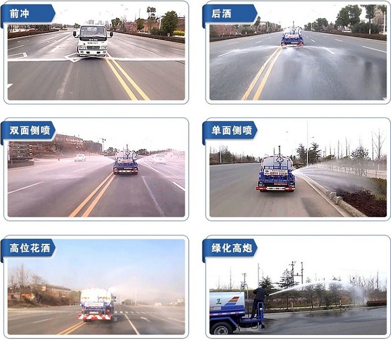 6、灑水車前噴頭位置較低,靠近地面,噴灑壓力較大,可用于沖洗路面;后噴頭位置較高(灑水車后噴頭一般左右各安裝一個(gè)),灑水面較寬,可用于公路施工灑水,使用后噴頭時(shí),應(yīng)將前噴管關(guān)閉;使用可調(diào)噴頭灑水時(shí),灑水寬度可根據(jù)需要調(diào)整。灑水寬度越寬,中間重疊量越少,灑水密度越均勻。