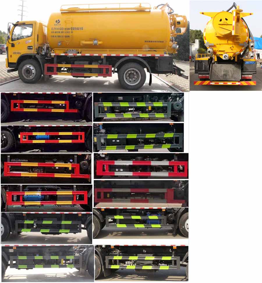 該車用于下水道排污及疏通,專用裝置:罐體、吸污泵、清洗沖刷總成.該車輛具有舉升功能,罐體外形尺寸(罐體總長×直徑)(mm):4900×1750(前面1600mm為清水罐,后部3300mm為污水罐);污水罐總容量:6.91立方米,污水罐有效容積:6.58立方米,介質:液態污物,密度800千克/立方米;清水罐有效容積:3.6立方米,介質:,密度1000千克/立方米;清水罐和污水罐為獨立罐體,清洗功能時用清水罐,吸污功能時用污水罐,污水罐和清水罐不可同時滿載,兩罐不可同時使用.ABS型號/廠家:ABS型號:ABS/ASR-24V-4S/4M,廠家:襄陽東風隆誠機械有限責任公司;側、后防護材料均為:Q235碳鋼,側、后防護均為螺栓連接,后部防護截面尺寸(mm):120×50,后部防護離地高度(mm):380;僅采用底盤3800mm軸距改裝.隨底盤選裝駕駛室,選裝油箱位置.選裝后部出口樣式,選裝側面樣式.隨底盤選裝車速89km/h.